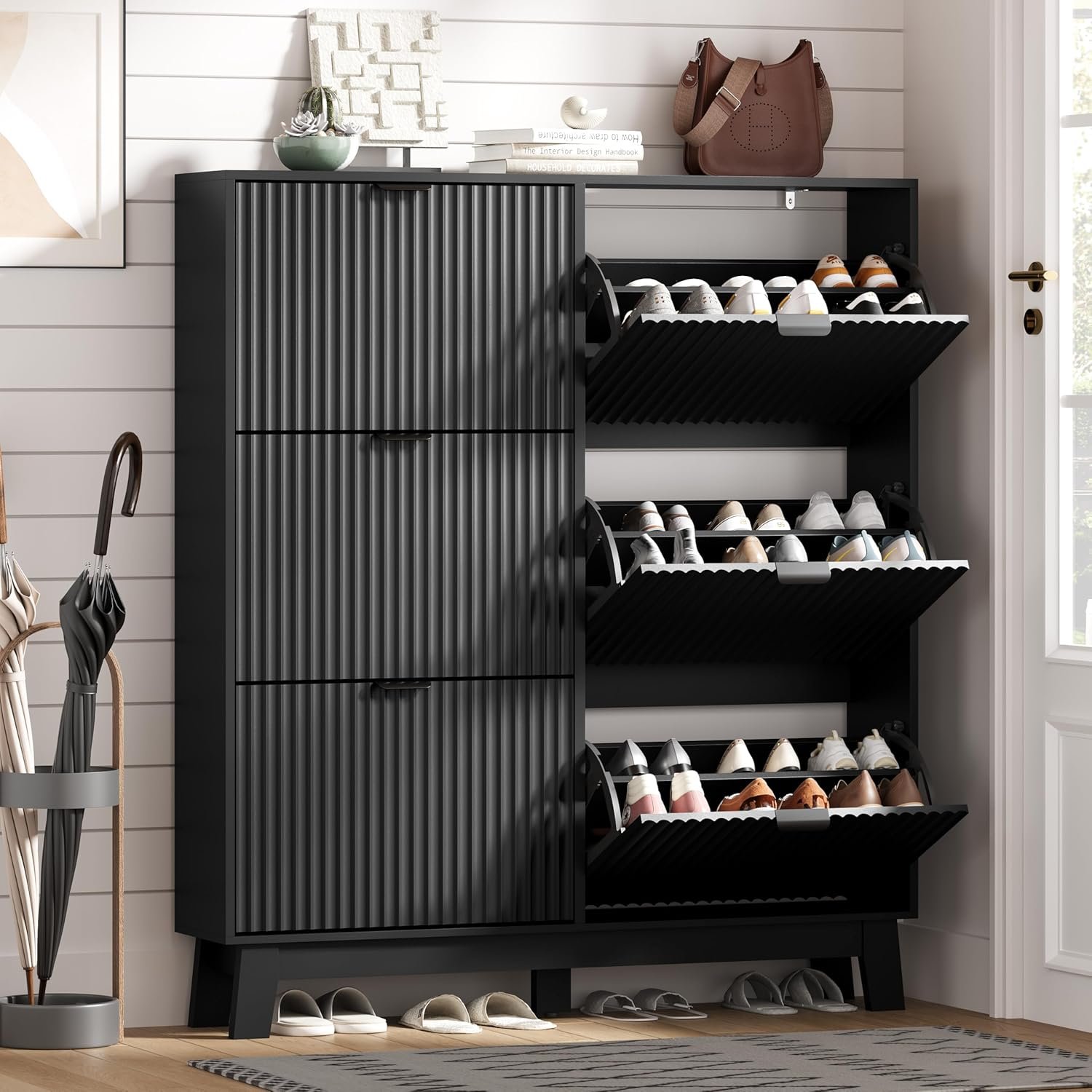 Shoe Cabinet Storage for Entryway with 6 Flip Drawers, Fluted Narrow Shoe Organizer with Wooden Legs, Freestanding Slim Shoe Storage Hidden Shoe Rack Organizer for Front Door Entrance, Black